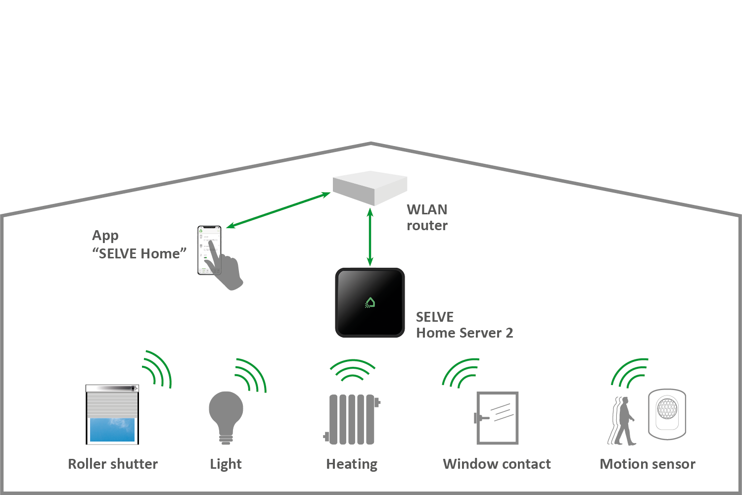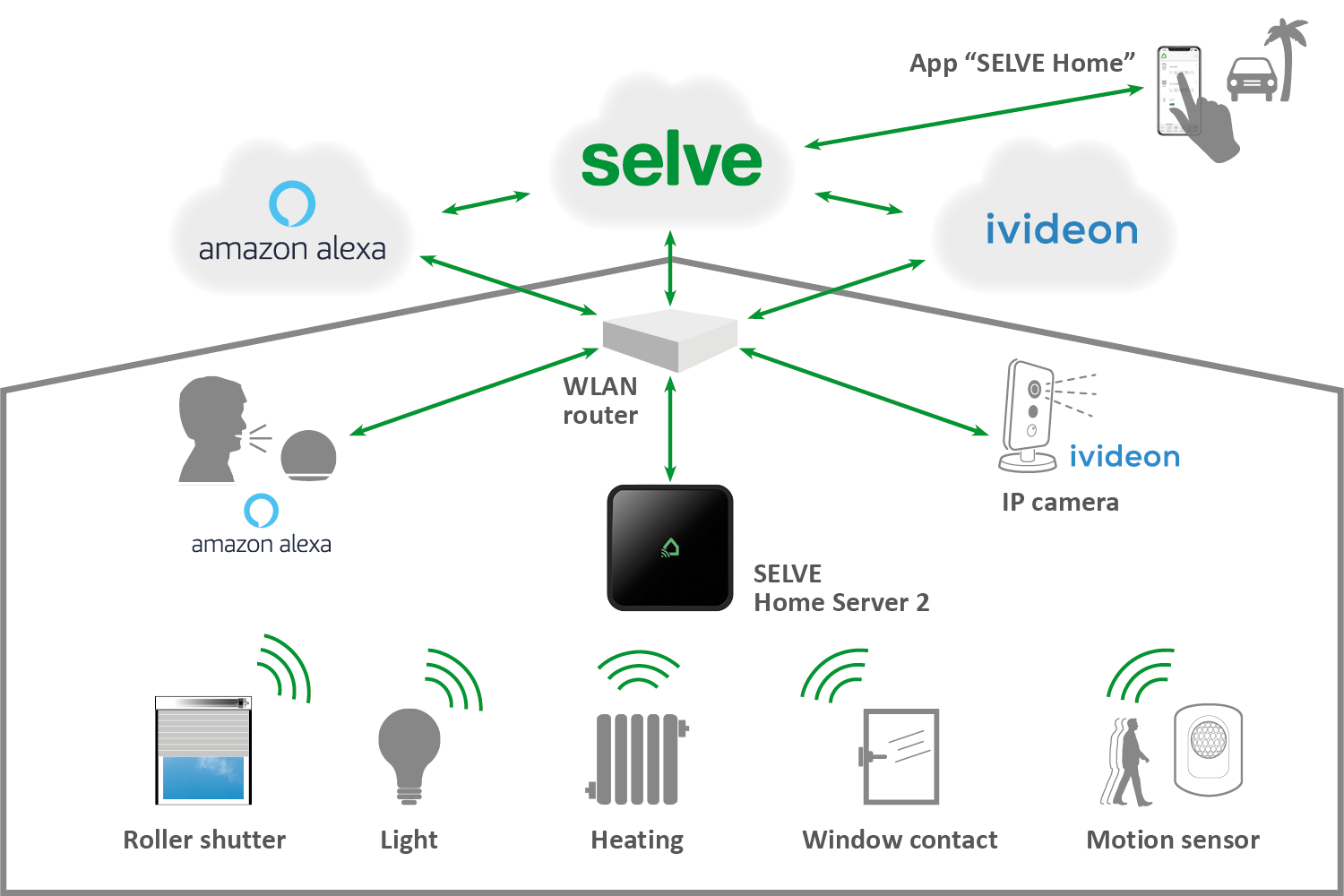 Example 2: The following features are available with an existing internet connection: Control from outside WiFi network (via SELVE cloud), voice control via Amazon Alexa & integration of the Ivideon IP camera