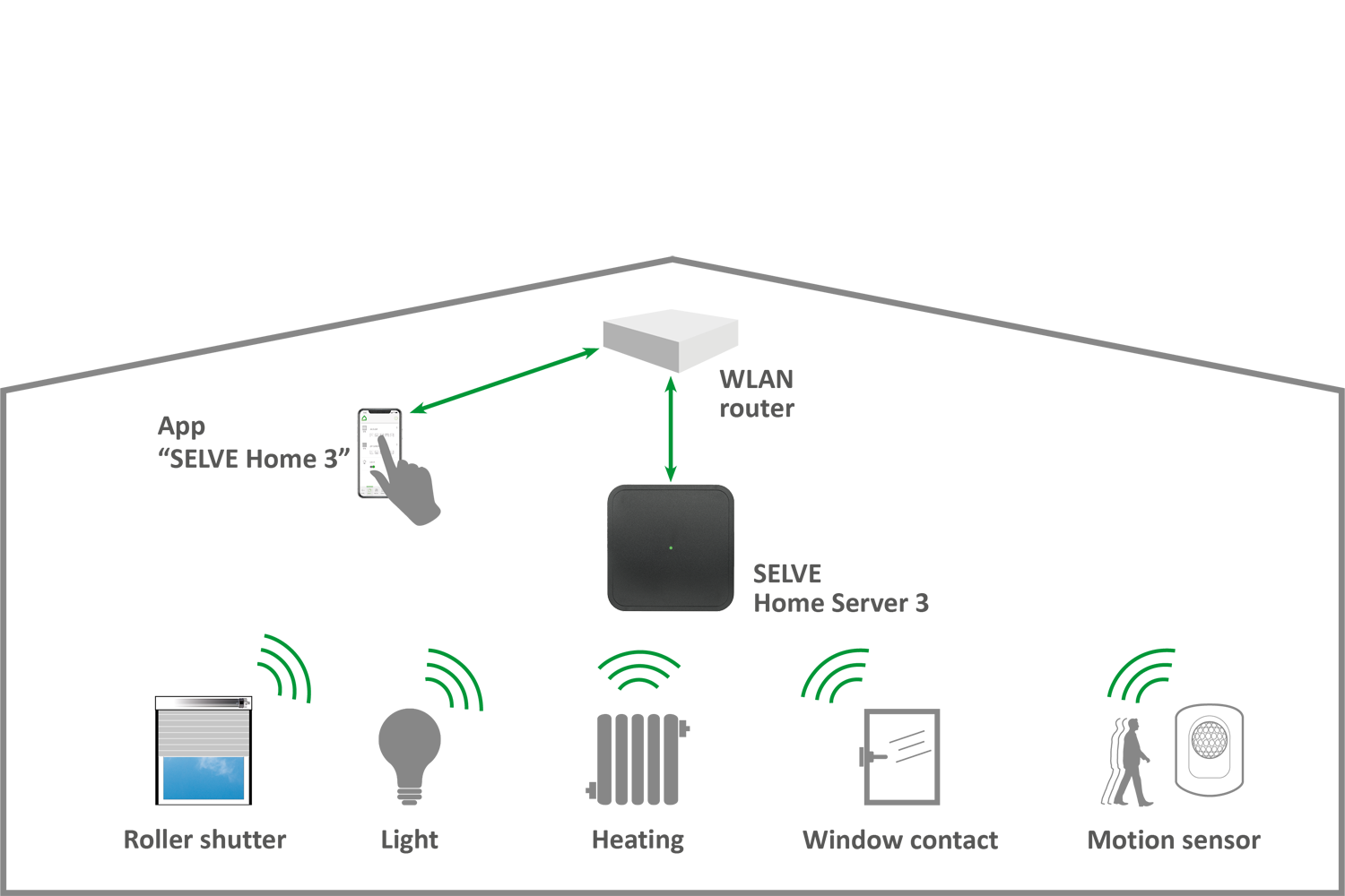 Example 2: With an existing internet connection, the following features are possible: operation from outside your own Wi-Fi (via SELVE Cloud), external control, and voice control via Matter.