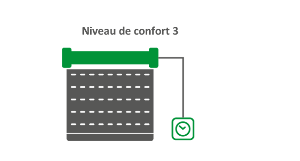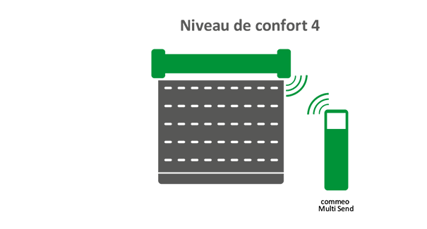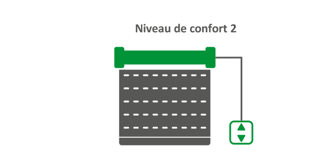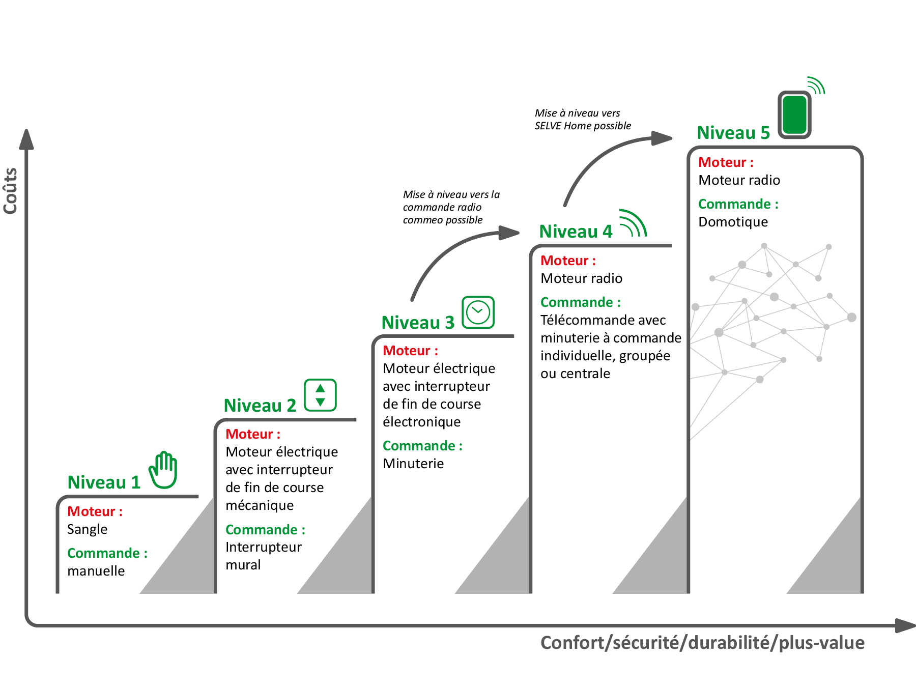 Nous proposons divers types de moteurs et de commandes adaptés à chaque budget pour apporter différents niveaux de confort, de sécurité, de durabilité et de plus-value à votre bien immobilier. Les cinq niveaux de confort sont décrits en détail ci-après.