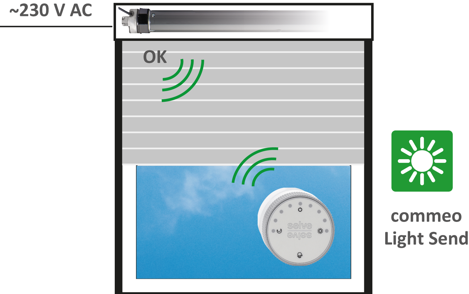 Der Sonnensensor commeo Light Send kann problemlos (nachträglich) in SELVE-Funkantriebe eingelernt werden und diese in Abhängigkeit der Lichtintensität steuern.