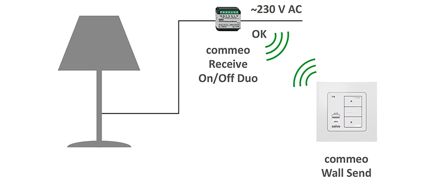 commeo Receive On/Off Duo: Ideal für die Steuerung von einem oder zwei elektrischen Verbrauchern bis zu 3 A Stromstärke. Außerdem gibt es Nebenstelleneingänge zur lokalen oder zentralen Bedienung.