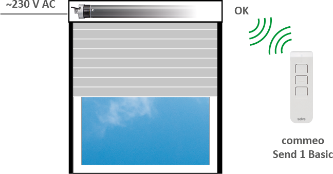 Mit dem commeo Send 1 Basic kann ein Funkantrieb einzeln gesteuert werden. Auch können mehrere Antriebe und Empfänger – beispielsweise alle in einem Raum – einprogrammiert und als Gruppe gesteuert werden.