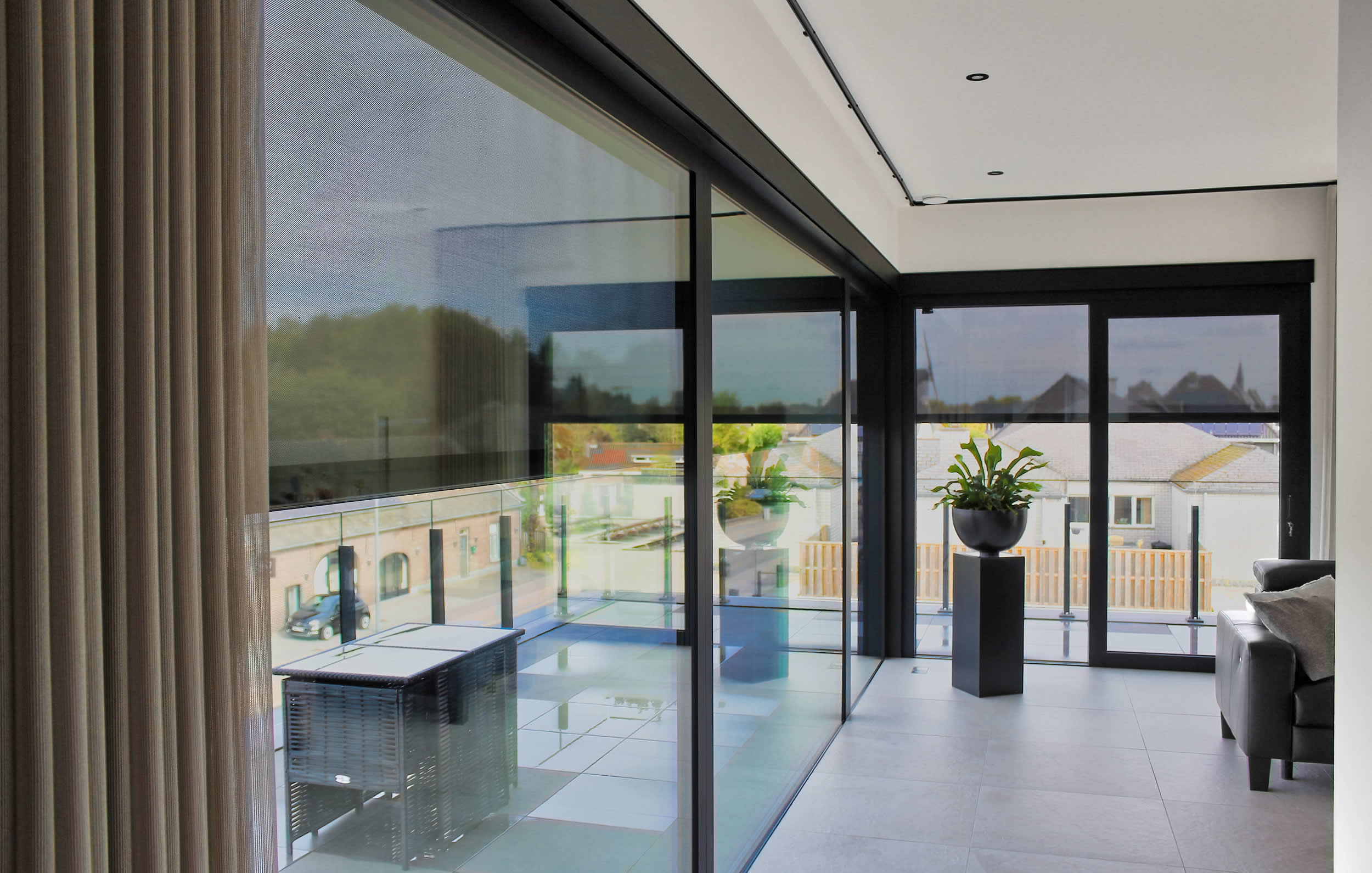 Penthouse charakteryzują duże przeszklenia z czarnymi aluminiowymi ramami, wykonane przez belgijskiego producenta Profel. Firma ta, podobnie jak producent osłon przeciwsłonecznych Wilms, jest wieloletnim partnerem SELVE. W penthouse’ie zastosowano precyzyjnie dopasowane zip-screens firmy Wilms z Meerhout, które zapewniają doskonałą ochronę przed słońcem i ciepłem. Właściciele podkreślają, że dzięki screen'om latem nie muszą używać energochłonnej klimatyzacji, a mimo to w mieszkaniu jest jasno. Screeny chronią również prywatność mieszkańców i są estetycznie zintegrowane z fasadą budynku.