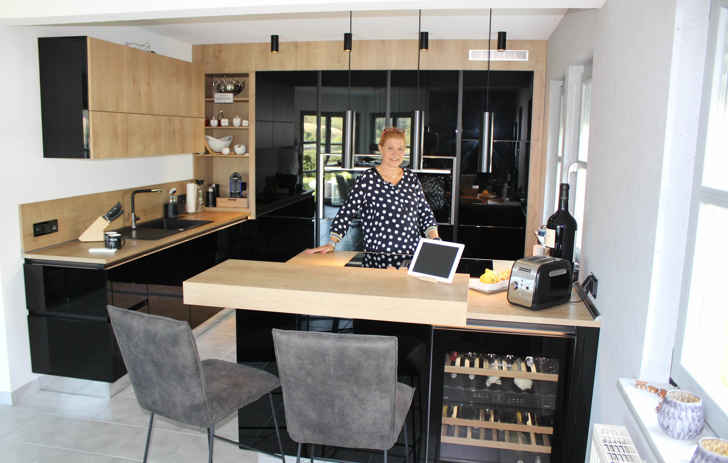 45 Quadratmeter eines 2001 erbauten Einfamilienhauses bekamen einen komplett neuen, ansprechenden Look, zugleich hielt modernste Technik Einzug: Die Hausbesitzer aus dem sauerländischen Altena haben ihre individuelle Traumküche realisiert, die als Herz des Hauses sehr offen gestaltet wurde. Ob zu zweit oder mit Freunden – in der Küche spielt sich das Leben ab, es wird gemeinsam gekocht, hier sowie im angrenzenden Ess/-Wohnraum ist Geselligkeit angesagt. Komfort und hohe Funktionalität standen nicht nur bei der Planung und Einrichtung der stilvollen Design-Küche im Fokus. „Bei der grundlegenden Modernisierung des gesamten Bereiches haben wir die Chance ergriffen und gleich auch die Rollläden motorisiert“, berichtet Andrea Sellmann. Hochwertigkeit ist bei den Küchenschränken, -geräten sowie dem Mobiliar im Ess- und Wohnzimmer durchgängig Programm – und trifft genauso auf die Wandbeläge zu. „Wir haben uns für hochwertige Tapeten in Beton-Optik entschieden, deshalb sollten weder Gurtwickler noch sichtbare Steuerungsschalter die Gesamt-Optik stören“, so die Bewohnerin. Deswegen waren SELVE-Funkantriebe für die Nachrüstung die erste Wahl, genauso wie ein portabler, multifunktionaler Funk-Handsender, der die Behänge automatisch nach individuellen Wünschen fährt.
